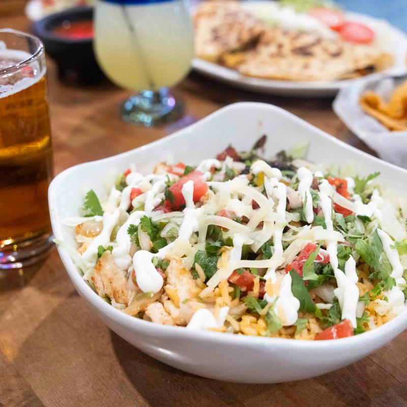Our famous taco salad with spinach, mushrooms, bell peppers, onions, and tomatoes topped with black beans, lettuce, sour cream, cheese sauce, and pico de gallo.