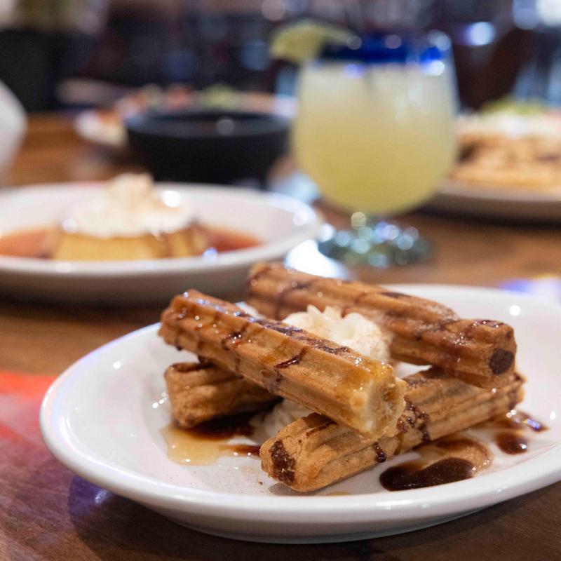 A flour tortilla deep-fried to a golden brown and topped with honey and cinnamon.